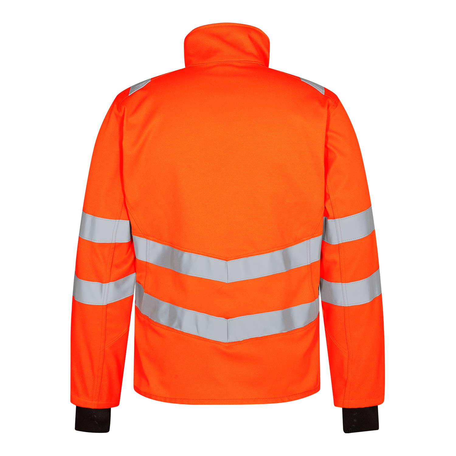 Dehnbare und funktionelle fluoreszierende Arbeitsjacke im modernen Design. Die Jacke hat einen hohen Kragen und ist hinten länger geschnitten. Der