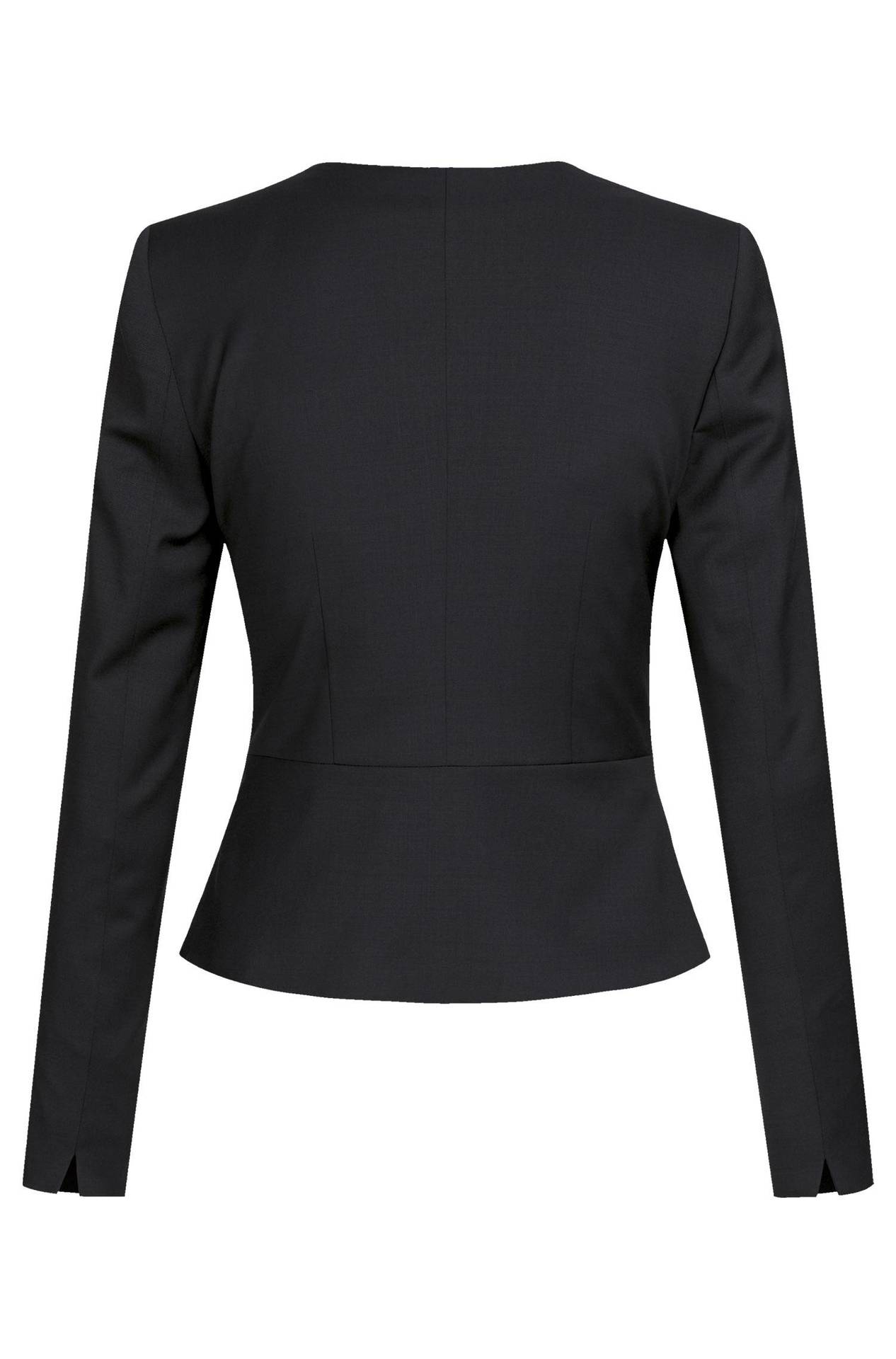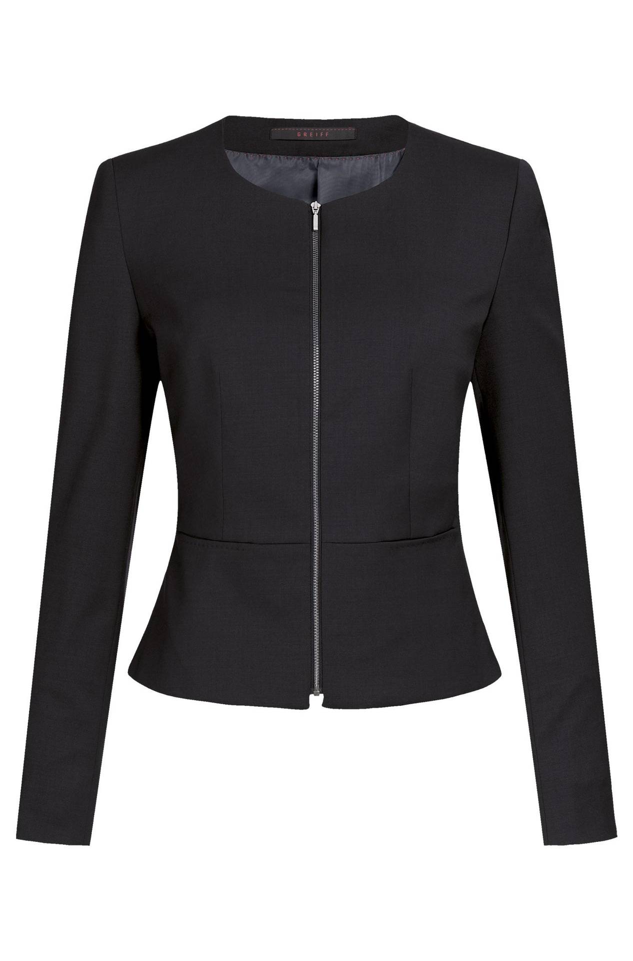Schmal geschnittener Damen-Blazer mit Rundhalsausschnitt. Der Kurz-Blazer aus der GREIFF Modern Kollektion zeichnet sich durch ein Schößchen und den AMF-Handstich aus. Er verfügt über 2 Nahttaschen sowie eine Reißverschluss-Innentasche. Stretch sorgt für perfekten Sitz und viel Bewegungsfreiheit.