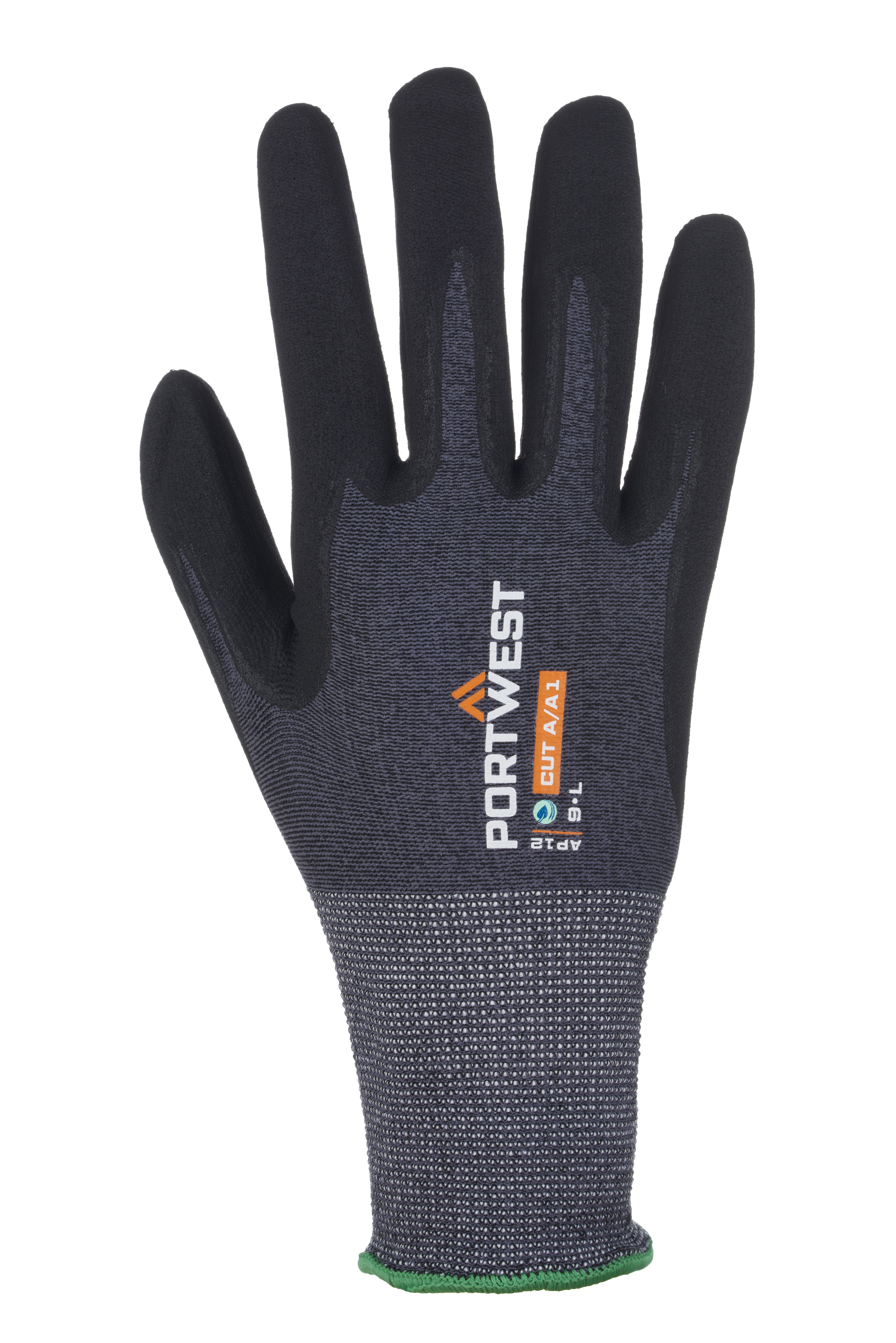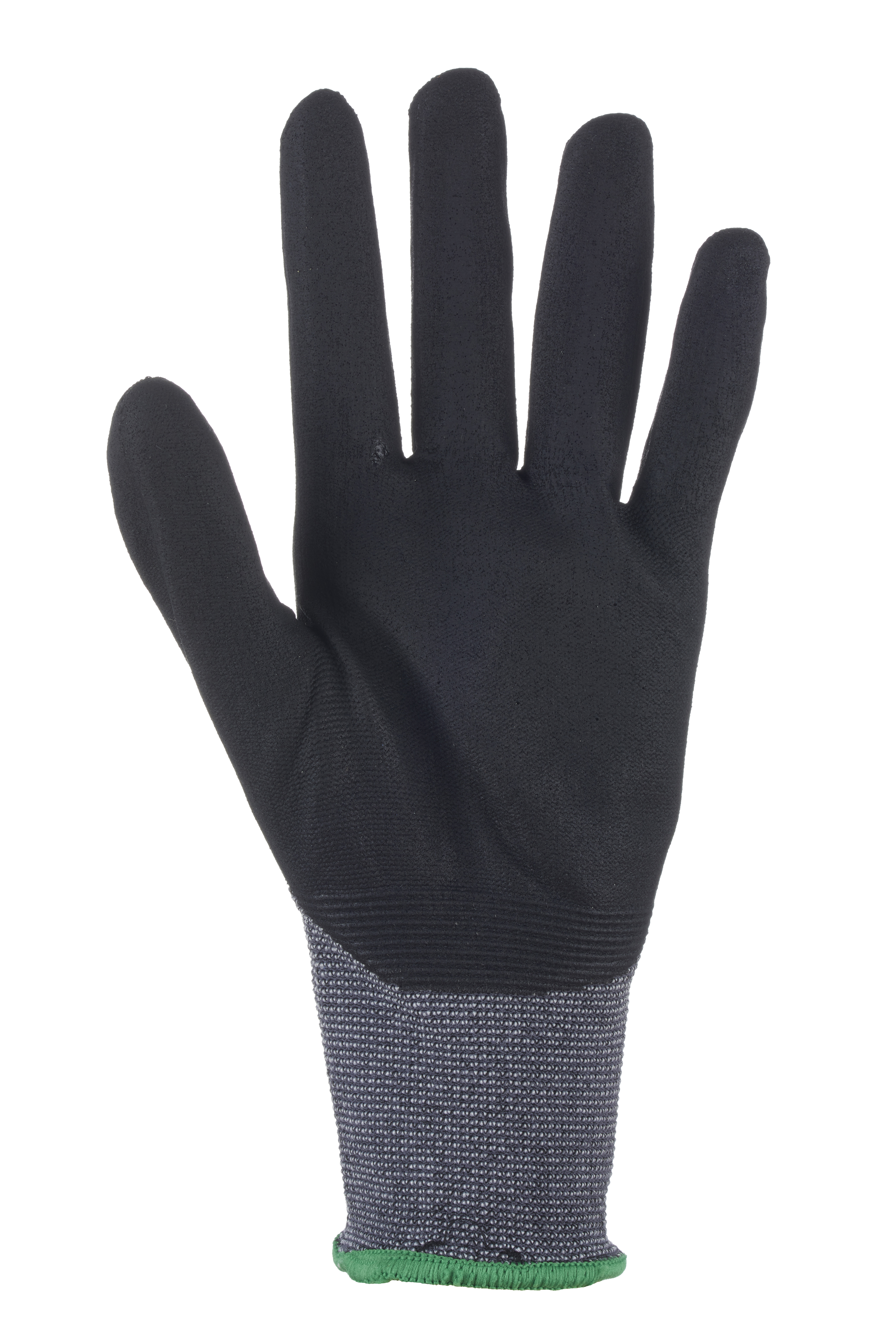 PET-Flasche-zu-Handschuh-Konzept für mehr Nachhaltigkeit. Das recycelte 15-Gauge-PET-Garn hat feuchtigkeitsregulierende Eigenschaften und hält die Hände trocken und komfortabel. Touchscreen-kompatibler Zeige- und Daumenfinger. Eine einzigartige Strickstruktur sorgt für einen abgesenkten kleinen Finger, der für eine gute Passform und mehr Komfort sorgt. Ein sehr niedriger CO2-Fußabdruck im Vergleich zur Herstellung anderer Garne wie Nylon, Polyester und Baumwolle. Die Mikroschaum-Nitril-Beschichtung bietet 360 Grad Atmungsaktivität. Micro-Cup-Struktur für hervorragenden Grip bei nassen und trockenen Bedingungen. Ultradünne Beschichtung für höhere Empfindlichkeit.
