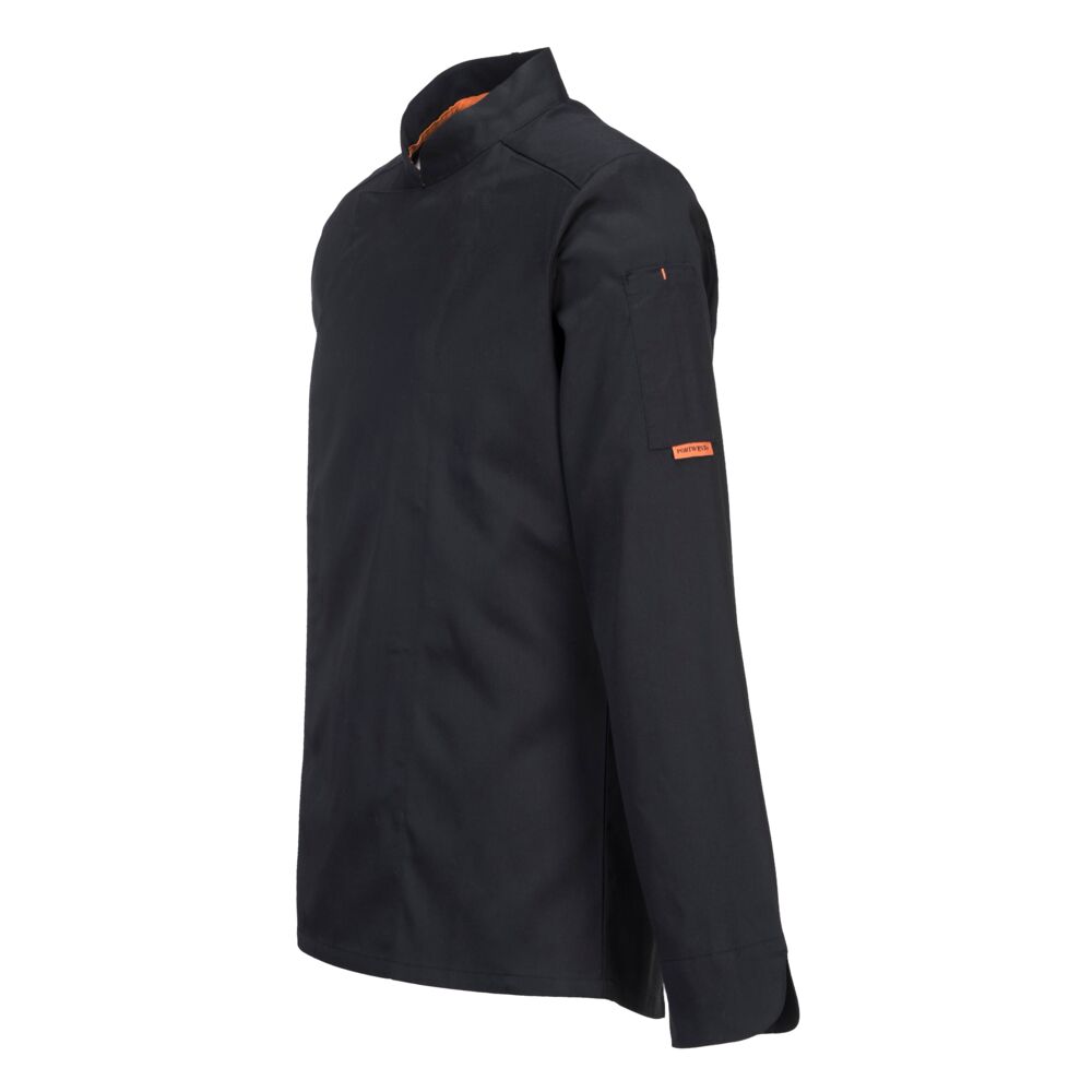 Diese Kochjacke besteht aus einem leichten Material und bietet einen modernen, schlanken Schnitt mit ergonomischer Passform. Die Jacke verfügt über einen zweireihigen, verdeckten Kugelknopfverschluss an der Vorderseite, eine Lasche im Nacken und große MeshAir Pro-Einsätze im Rücken und im Achselbereich für hervorragende Atmungsaktivität.