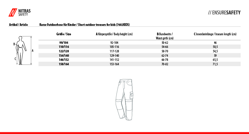 Die Nitras Motion Tex Kids 7612 (auch 7612KIDS) ist eine speziell für Kinder konzipierte, robuste Outdoor- und Arbeitshose, die Strapazierfähigkeit, Funktion und Komfort in Einklang bringt. Gefertigt aus 65 % Polyester / 35 % Baumwolle mit einem Flächengewicht von ca. 280 g/m², bietet sie eine solide Basis für belastungsgerechte Einsätze.