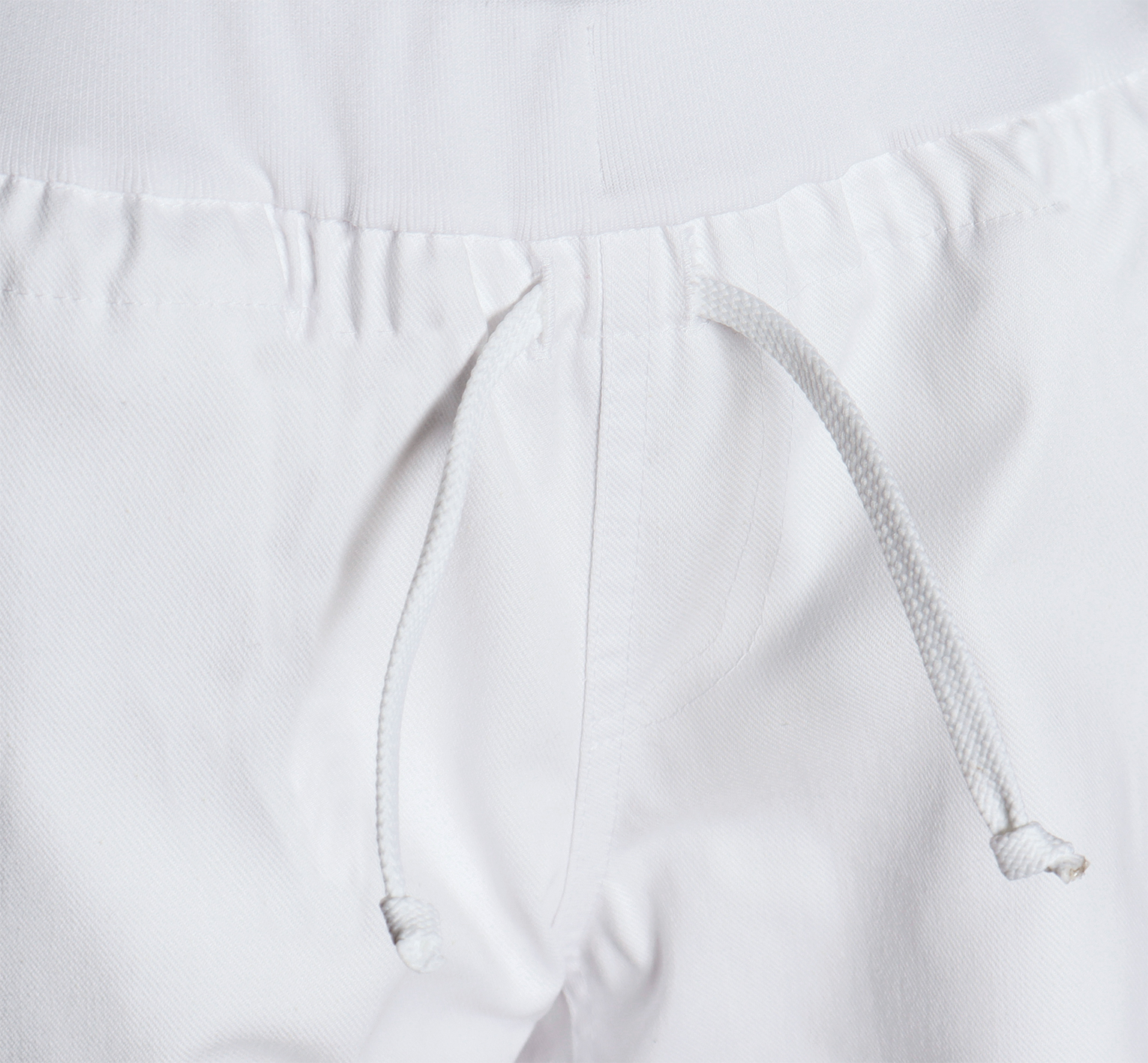 - Breites Rippbündchen mit Gummizug und Kordel im Bund