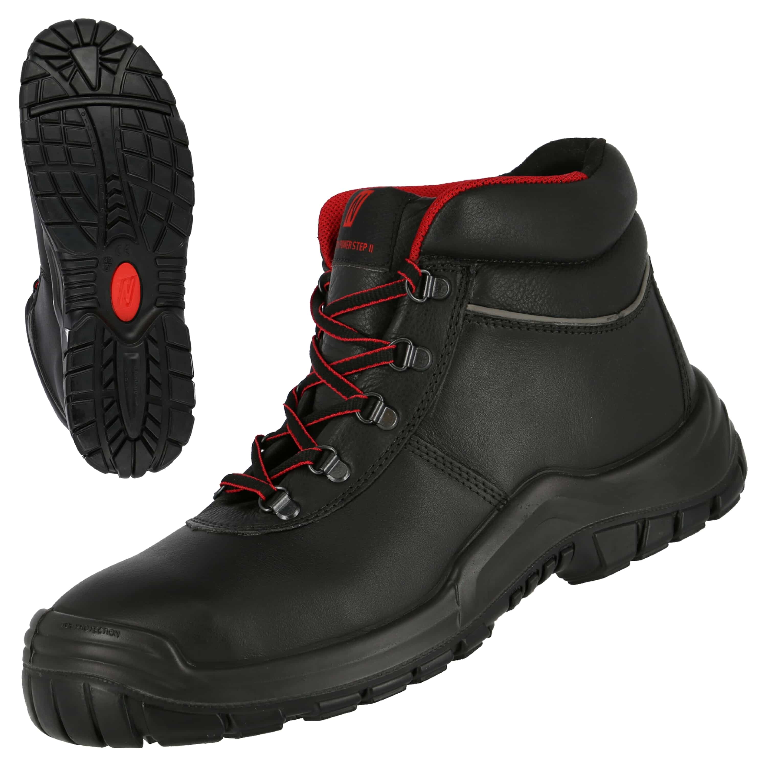 NITRAS POWER STEP MID, Sicherheitsstiefel, halbhoch, S3 HI HRO, strapazierfähiges Vollleder, widerstandsfähige PU / Nitril-Laufsohle, schwarz, Zehenkappe aus Stahl, durchstichhemmende Zwischensohle aus Stahl, hochwertige Einlegesohle 700C // COMFORT STEP, ergonomisch geformt, ansprechendes Design, abgeflachte Ferse für eine natürliche Abrollbewegung, bestmögliche Rutschhemmung (SRC), Weite 11, zusätzliche Überkappe, gut gepolsterter Schaft für bestmöglichen Halt und Komfort, Fersenfutter für ein einfaches An- und Ausziehen sowie Fersenverstärkung aus robuster Mikrofaser, Premium-Qualität, DGUV Regel 112-191-zertifiziert.
