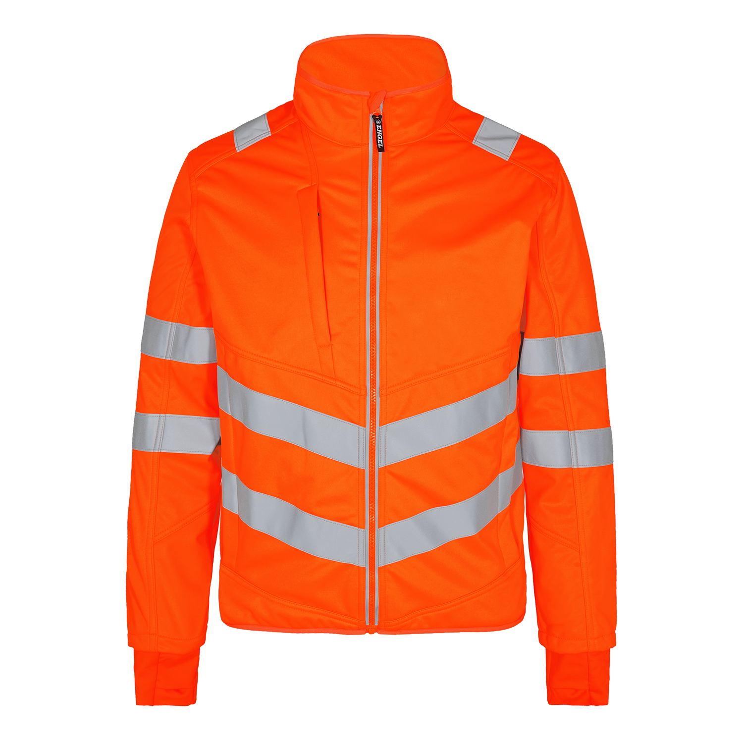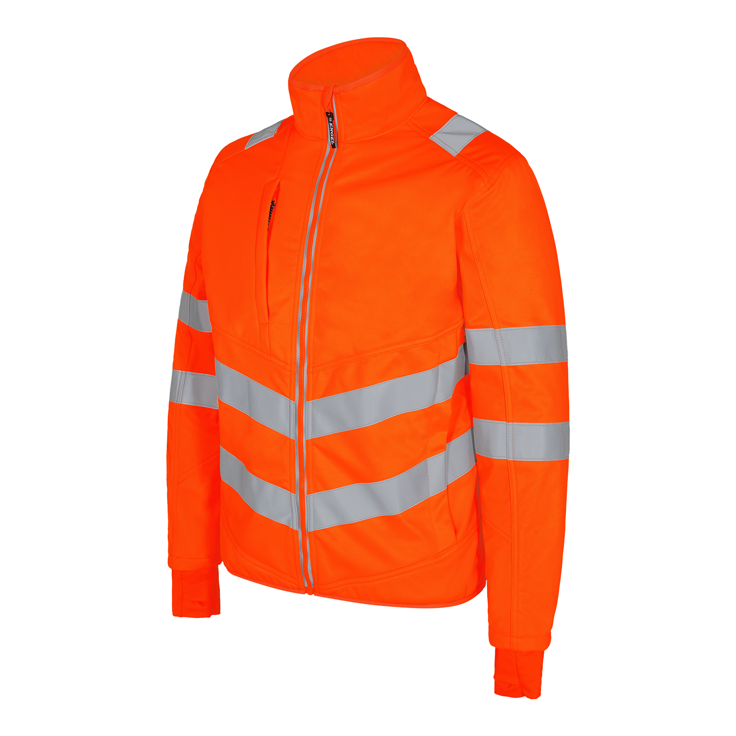 Funktionelle, fluoreszierende Softshelljacke im modernen, ansprechenden Design mit wind- und wasserabweisenden Eigenschaften. Innen- und Kragenbereich mit Fleece gefüttert, daher weich und hautfreundlich. Stretch-Material für hohen Komfort und Bewegungsfreiheit. Reflektierender Reißverschluss vorne. Zwei großzügige Seitentaschen sowie eine Brusttasche, jeweils mit Reißverschluss. Zwei große Innentaschen mit Klettverschluss. Elastischer Bund unten. Ärmel mit elastischem Windfang und Daumenöffnung; zusätzlicher Windfang aus elastischem Material in den Ärmeln. Der Windfang mit Daumenöffnung kann zum Kälteschutz über die Hand gezogen werden. Reflexstreifen über der Schulterpartie sowie rund um Ärmel und Taille. Bekleidungsklasse 2. Getestet nach 25 Wäschen.