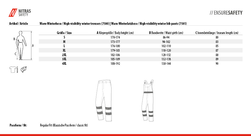 Die NITRAS MOTION TEX VIZ 7580 Winter‑Warnhose ist eine hervorragende Wahl, wenn Sie Sichtbarkeit, Kälteschutz und Funktionalität in einem Kleidungsstück vereinen wollen. Robust, professionell und optimal geeignet für Einsätze bei Schneefall, Regen, Kälte und Außenarbeiten.