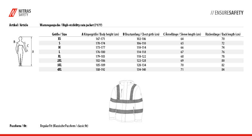 | Normen Schutzkleidung: | EN 343: Wetterschutz, EN ISO 20471: Warnschutz Klasse III, ISO 13688: Schutzkleidung - Allgemeine Anforderungen |